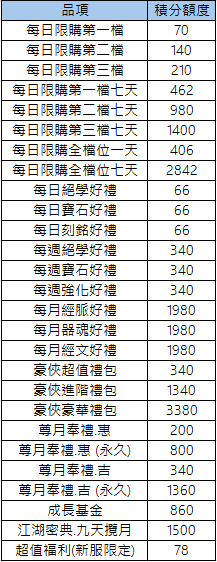 不再上述列表之禮包,將依照其台幣定價,以1台幣=2積分的形式進行轉換。實際積分以遊戲獲得為準。